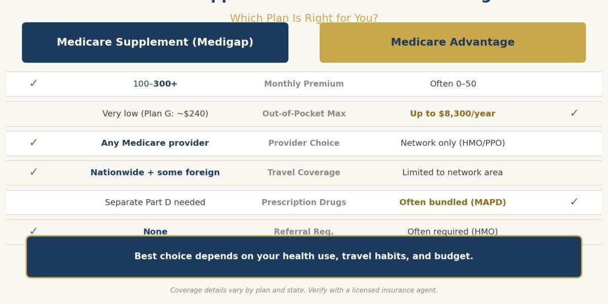 Medicare Supplement and Medicare Advantage are fundamentally different structures. Supplement works alongside Original Medicare and fills in cost gaps. Advantage replaces Original Medicare with a private plan that bundles coverage but uses a provider network.