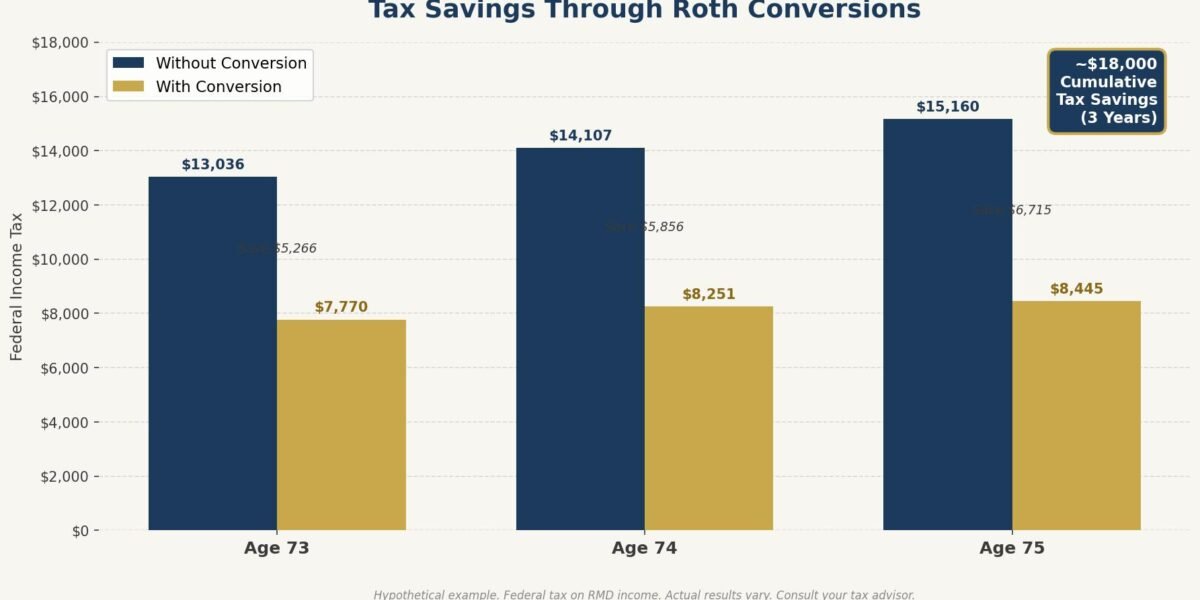 - The $18,000 savings figure in this hypothetical scenario reflects federal income tax savings in just the first three years of RMDs — not the cumulative lifetime benefit, which is substantially higher.
