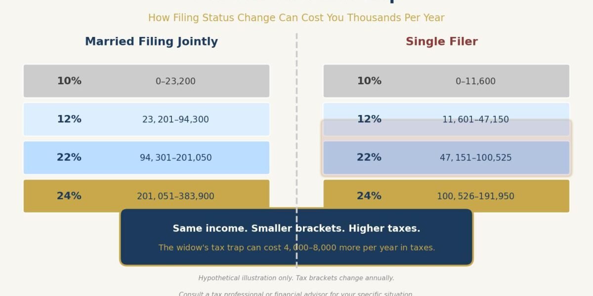 This is the widow’s tax trap, and it catches most people completely off guard. The good news is that couples who understand how it works can take steps now to soften the blow. In this article, I will walk through exactly what happens when a filing status changes, show you the real dollar impact through a hypothetical case study, and lay out five strategies that may help reduce the damage.